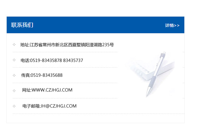 地址:常州市新北區友邦商務大廈1幢16、17層  電話:0519-85101652  傳真:0519-85112595  郵編:213022  網址:www_cz-jiayue_cn.szzxzz.com  郵箱:xiajifengaa@163.com
